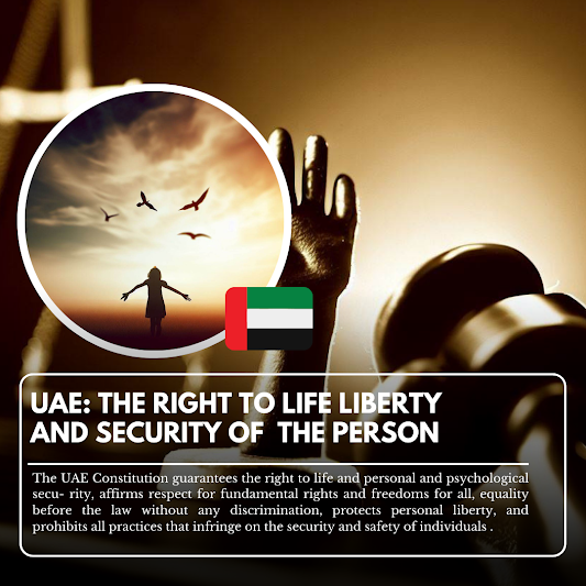A fundamental human right recognized by the International Declaration of Human Rights is the individual's right to life, liberty, and security. This right is guaranteed to all people living inside the UAE's boundaries by the constitution, which is consistent with the country's dedication to upholding human rights and freedoms. This constitutional guarantee affirms respect for fundamental freedoms for all people, equality before the law devoid of any form of discrimination, protection of individual liberty, and a ban on any actions that compromise people's security and safety, such as detention, search, or imprisonment unless permitted by law.  In addition, the constitution and laws of the UAE uphold freedoms and rights, forbid torture, arbitrary detentions, and any other types of cruel, inhumane, or degrading treatment. Civil rights are also guaranteed, including the freedom of thought, speech, and the press as well as the right to peaceful assembly, association, and...